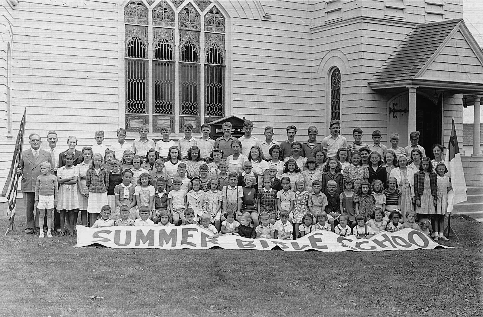 The above photograph of the Summer Bible School of the Methodist Protestant Church of Eastport, NY was taken about 1939 - 1941. Several individuals have attempted to identify the 90 people in the picture. If anyone knows additional names or corrections to the following list please e-mail these to me [[email protected]]. Spelling corrections would be appreciated.